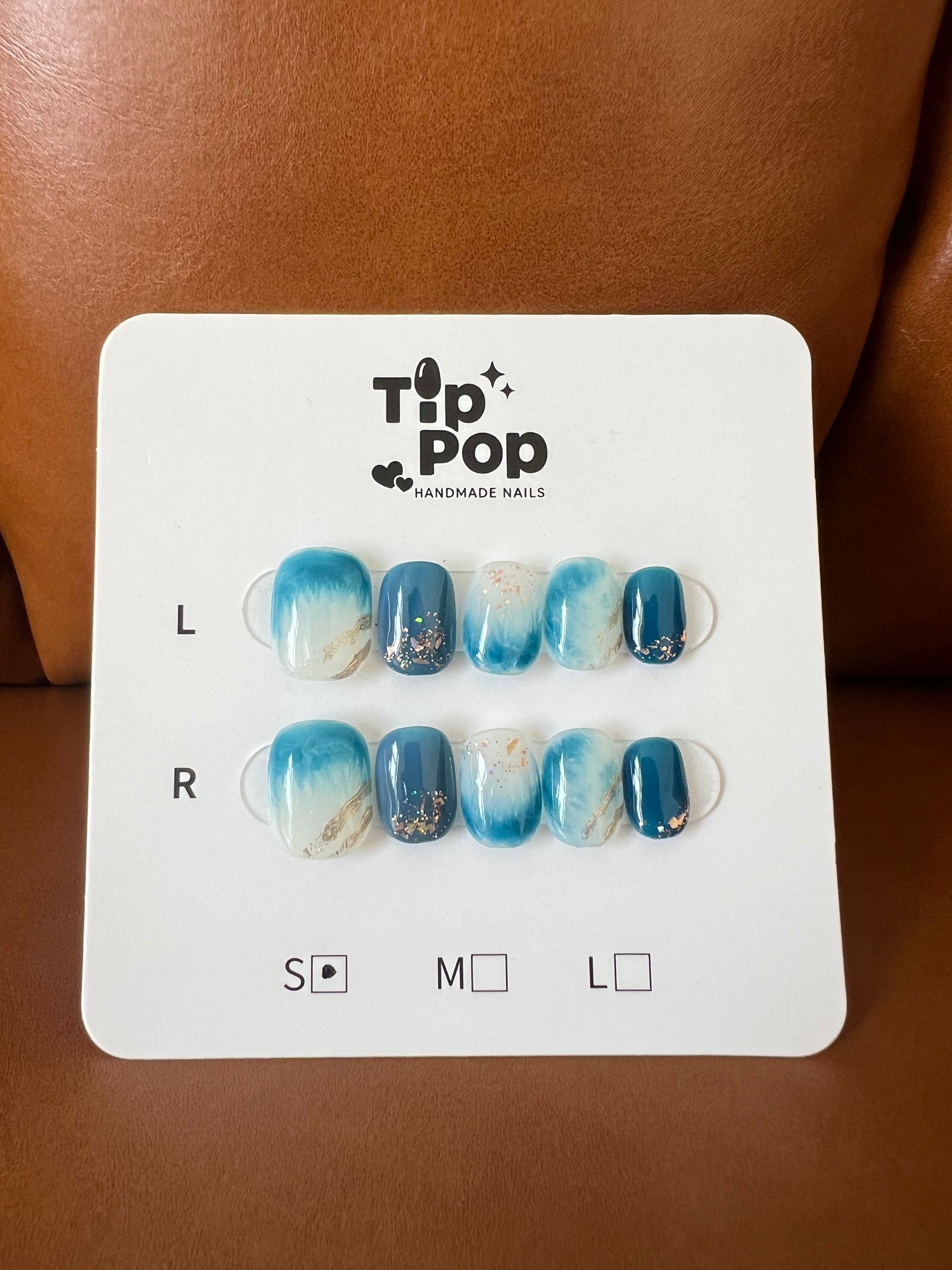 Blue ombré with gold flakes — like waves catching the sunlight. A fresh, breezy set perfect for summer vibes and seaside days.