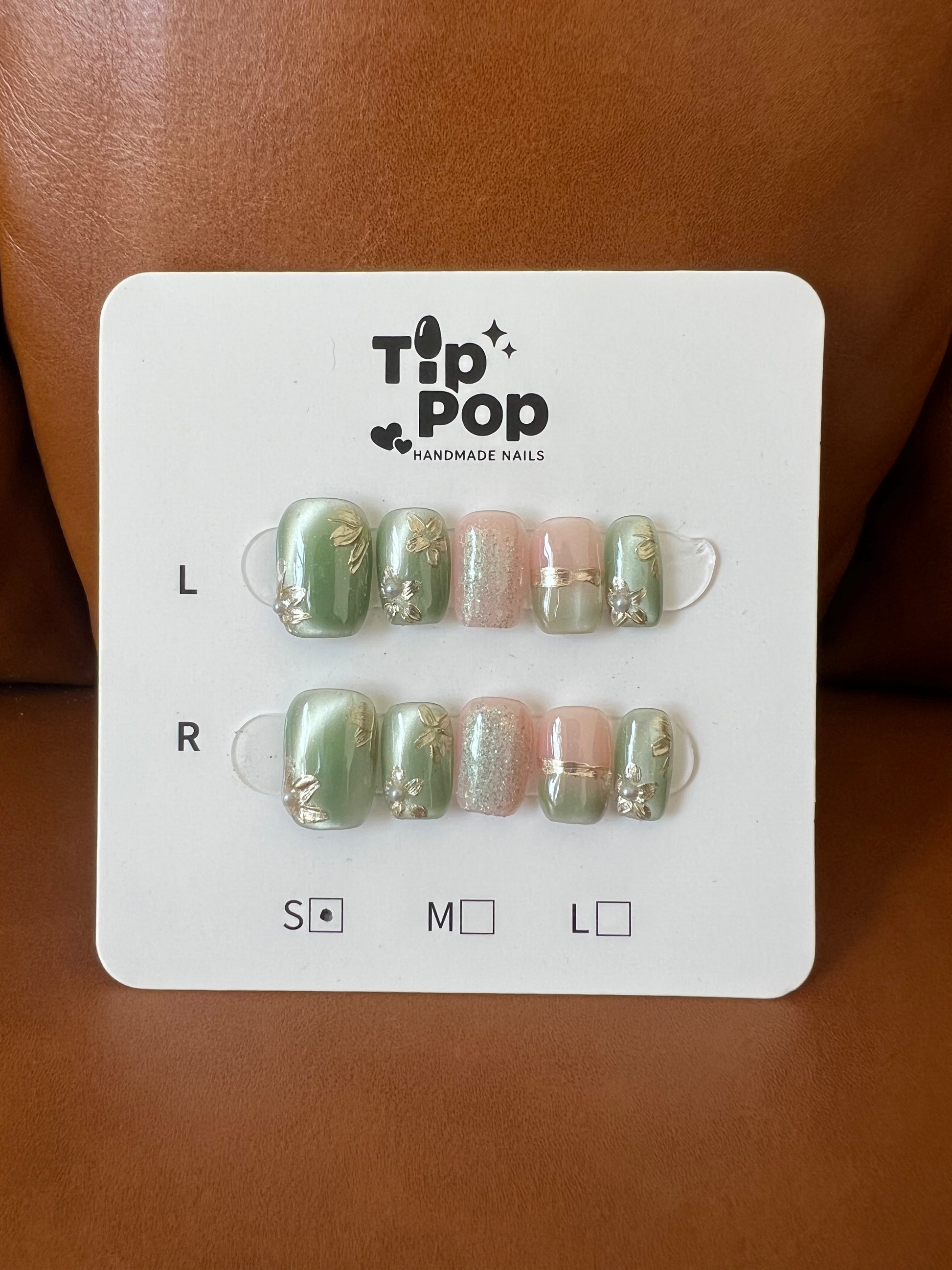 Soft green and blush pink tones paired with delicate gold accents — like a blooming garden on your fingertips. Perfect for a fresh and feminine look.
